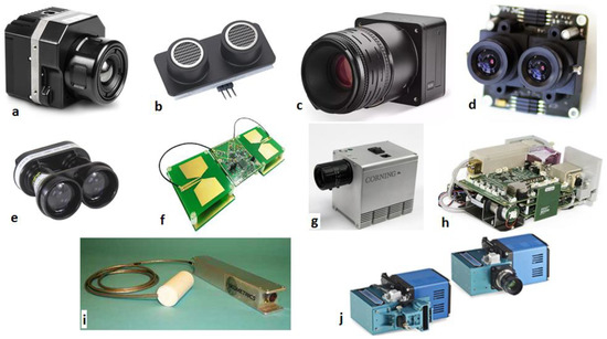 無人機(jī)04 00034 g004 550 圖4. 采礦無人機(jī)上常用傳感器的示例:(a)紅外傳感器[ 123 ],(b)超聲傳感器[ 124 ],(c)RGB攝像機(jī)[ 125 ],(d)立體攝像機(jī)[ 126 ],(e)激光測距儀[ 126 ],(f)超寬帶雷達(dá)(UWB)[ 127 ],(g)高光譜傳感器[ 128 ],(h)磁傳感器[ 129 ],(i)氣體探測器[ 130 ], (j)可見和近紅外光譜范圍(VNIR)[ 131 ]。