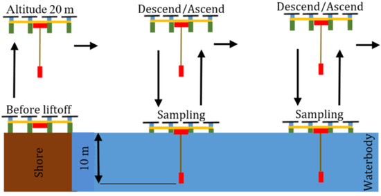 這項研究的目的是開發(fā)和測試用于湖泊溫度曲線和監(jiān)測的水溫測量系統(tǒng)無人機。Koparan等人報道了現(xiàn)場水質(zhì)測量無人機。[ 19 ]通過用深度和溫度傳感器替換傳感器節(jié)點進行了重新建模,并對無人機上的浮力裝置進行了修改,以實現(xiàn)更安全的著陸。這里介紹的系統(tǒng)的新穎性在于,當溫度和壓力探頭下降時,無人機開始測量溫度和深度。該系統(tǒng)的另一個關(guān)鍵特征是,無人機可以降落在水面上并從水面上起飛,而不必在測量過程中懸停。