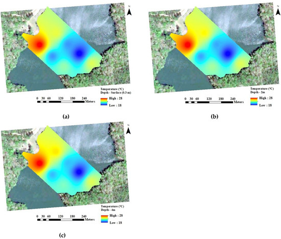每個位置的測量次數(shù)取決于水深。深度測量表明下降過程中探頭的深度。因此,一旦探頭到達水柱底部,就有望進行重復(fù)測量。在一定深度后重復(fù)進行的測量被指定為該采樣位置的最大水深。收集的水深和溫度數(shù)據(jù)用于創(chuàng)建測深圖和水溫圖,以可視化地表(0.3 m)以及2 m和4 m深度處的水溫分布。逆距離加權(quán)插值(IDW)方法用于ArcMap(ESRI,Redlands,CA,美國)中的處理和插值。27 ]。評估水深,水溫和位置之間的關(guān)系。在R軟件(R-GUI,維也納,奧地利)驅(qū)動的3D散點圖中說明了水溫分布[ 28 ]。