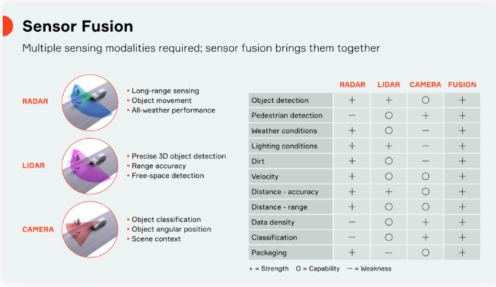 每種傳感器類型或“模態(tài)”都有其固有的優(yōu)點和缺點。雷達即使在惡劣的天氣條件下也能精確確定距離和速度,但是卻無法讀取路牌或“看見”交通信號燈的顏色。相機可以很好地讀取標志或對物體進行分類,例如行人,騎自行車的人或其他車輛。但是,它們很容易被灰塵,陽光,雨水,雪或黑暗所蒙蔽。激光雷達可以準確地檢測物體,但是它們沒有照相機或雷達的承受能力或承受能力。