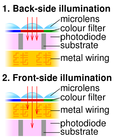 背面照明(BSI或BI)提供了一種有趣的選擇,因?yàn)榭刂齐娮釉O(shè)備不會限制光敏區(qū)域。但是,光以較低的量子效率(到達(dá)傳感器的光子數(shù)與在終端收集的電荷載流子數(shù)之比)進(jìn)一步傳播。下圖說明了背面和正面照明。