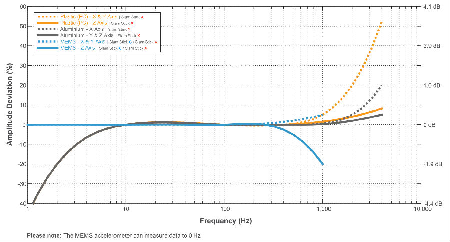通常將帶寬指定為相對于參考頻率靈敏度(通常為100 Hz)的公差帶?梢砸园俜直群/或dB為單位指定公差帶,典型的頻段為±5%,± 10%, ±1 dB甚至±3 dB。大多數(shù)數(shù)據(jù)手冊都會提供典型的頻率響應(yīng)曲線,以為用戶提供幫助。下面以enDAQ傳感器(以前為Slam Stick)的頻率響應(yīng)為例(摘自數(shù)據(jù)表);它也方便地將分貝與百分比偏差進(jìn)行比較。