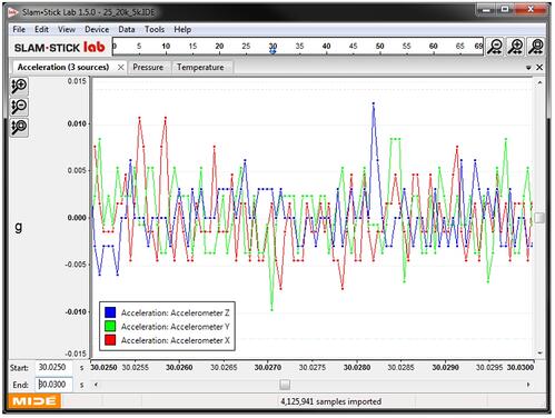 加速度計(jì)-寬帶噪聲噪聲級別可以通過多種不同方式定義。一些加速度計(jì)會將殘余噪聲定義為寬帶RMS值,通常以μV或μg為單位 。這是通過在沒有任何機(jī)械激勵的情況下取信號的均方根來計(jì)算的。低于寬帶噪聲水平的加速度將無法解決。 當(dāng)使用5 kHz低通濾波器以20 kHz采樣時,我在enDAQ傳感器的±25g寬帶噪聲的右邊添加了一張圖像 。該數(shù)據(jù)表 指定了一個噪聲電平小于0.01克RMS; 您會發(fā)現(xiàn)噪聲水平通常在 ±0.01g范圍內(nèi)。