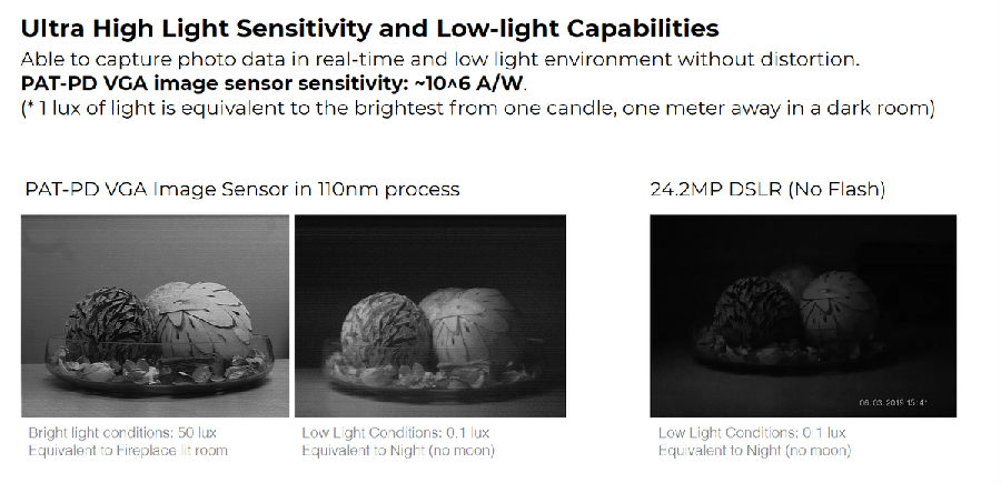 一個(gè)例子是SeeDevice的技術(shù),稱為PAT-PD(光子輔助隧穿照片檢測器),該技術(shù)實(shí)際上是消除了傳感器所說的“光子泄漏”,該公司稱這種技術(shù)將可見光和近紅外照片功能結(jié)合在一起。聲稱的好處包括在減少運(yùn)動失真,低光捕獲和動態(tài)范圍等領(lǐng)域超越了當(dāng)今的傳感器。該公司已經(jīng)在其網(wǎng)站上發(fā)布了幾張比較圖像,其中包括一張?jiān)跇O低光靜止圖像下勝過DSLR的圖像。