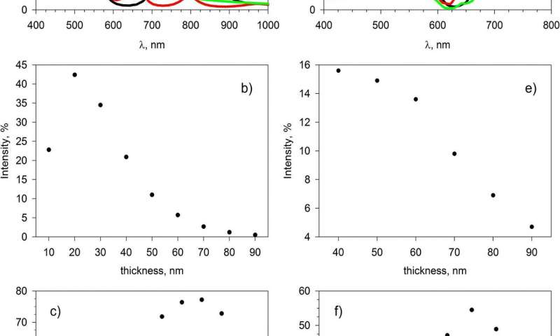 a)一維PC和PPC的透射光譜。虛線是PC的頻譜。粗線是具有30 nm Au層的PC的光譜。紅線是具有30 nm Au和270 nm緩沖層的PC的光譜。細(xì)線是30納米金層的透射光譜。b)對于Au層厚度的不同值,一維PPC的透射峰的強(qiáng)度。d)3D PC和PPC的透射光譜。虛線是PC的頻譜。粗線是具有40nm Au層(p極化)的PC的光譜。紅線是具有40nm Au和280nm緩沖層的PC的光譜。細(xì)線是具有40 nm Au層(s極化)的PC的光譜。e)繪制的3D PPC傳輸峰強(qiáng)度與金層厚度的關(guān)系 圖圖片來源:喀山聯(lián)邦大學(xué)