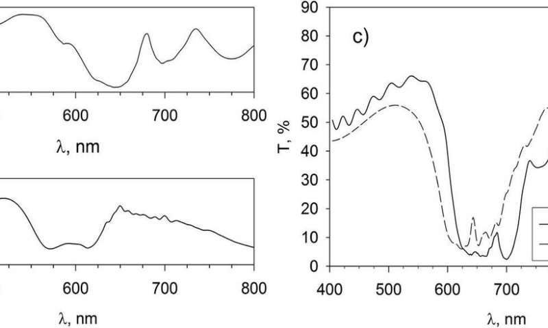 a)具有30 nm Au層的PPC的透射光譜。b)獨(dú)立的40納米金連續(xù)層的透射光譜。c)帶帽的PPC的透射光譜。虛線是獨(dú)立的40納米金制帽的光譜范圍 圖片來源:喀山聯(lián)邦大學(xué)