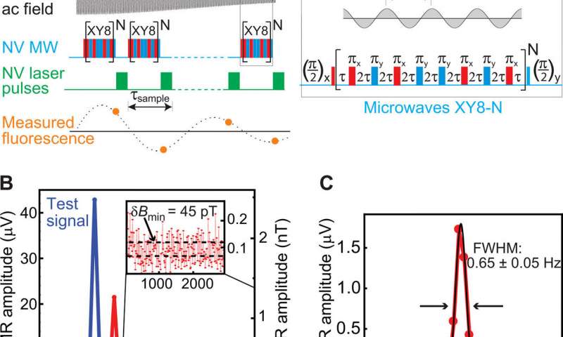 預(yù)極化的NV NMR的表征。(A)同步讀出脈沖序列。它由一系列XY8-N脈沖組成,這些脈沖對由處理核產(chǎn)生的交流磁場進行連續(xù)的相位測量。測得的熒光反映了核交流場投影的混疊形式。每2.5到4.25 s(流動1.25 s,其余用于檢測)重復整個序列。(B)水(紅色)和施加的2.5nT振幅測試場(藍色)的NV NMR光譜(傅里葉變換的絕對值),有效采集時間為5.2 s(平均60條跡線;總測量時間為150 s) )。從處理后的光電探測器信號獲得的NMR信號幅度以μV記錄。磁場幅度的轉(zhuǎn)換(以nT為單位)是從校準的測試場得出的。插圖:本底噪聲的SD顯示aBmin = 45 pT。根據(jù)這些數(shù)據(jù),我們推斷出最低可檢測濃度為27 M s1 / 2(SNR = 3)。加上所有的實驗死區(qū)時間,濃度靈敏度約為45 M s1 / 2。(C)水的高分辨率NV NMR光譜(傅里葉變換的虛部)顯示半峰全寬(FWHM)的線寬為0.65±0.05 Hz。通過平均60條跡線(每條3 s長)獲得數(shù)據(jù)。圖片來源:Science Advances,doi:10.1126 / sciadv.aaw7895 65±0.05赫茲。通過平均60條跡線(每條3 s長)獲得數(shù)據(jù)。圖片來源:Science Advances,doi:10.1126 / sciadv.aaw7895 65±0.05赫茲。通過平均60條跡線(每條3 s長)獲得數(shù)據(jù)。圖片來源:Science Advances,doi:10.1126 / sciadv.aaw7895