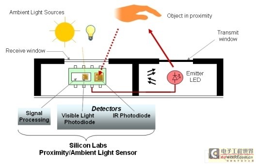 Si1143 紅外接近傳感器包括三個紅外LED驅(qū)動器,紅外線光電二極管,一個環(huán)境光傳感器和控制邏輯IC組成,外部的發(fā)射LED可以根據(jù)用戶的需要靈活安裝和配置。如圖1所示。