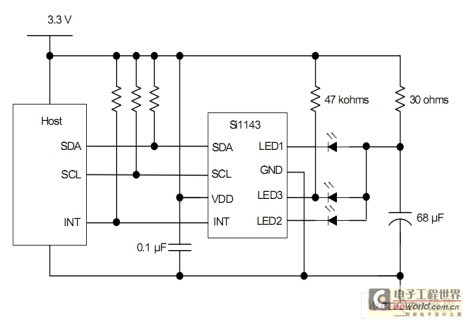 與Si1120不同的是,Si1143帶了三個LED驅(qū)動,當連接多個紅外LED時,如果只有單個LED驅(qū)動(如圖6所示),則需通過MCU來控制MOS管分時驅(qū)動LED,而Si1143(如圖7所示)本身就已具備3個LED驅(qū)動,所以可以直接連接到不同的LED 引腳,勿需再另加外圍器件,為硬件設計節(jié)省了成本。另外,Si1143采用?SMBus接口,可兼容I2C通訊,通用性更強,同時也方便軟件的設計。
