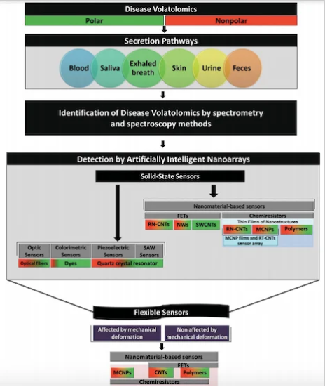基于納米材料的傳感器檢測(cè)VOC以識(shí)別疾病的示意圖。圖片由《 小日記》提供