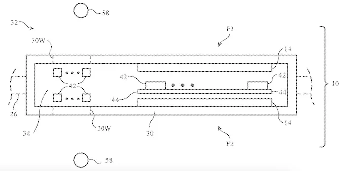 蘋果公司的紅外專利申請(qǐng)顯示了一個(gè)外殼的簡(jiǎn)單橫截面圖,其中包含諸如PCB(標(biāo)記為44),組件(標(biāo)記為42)和以窗口布置方式顯示的光學(xué)元件(標(biāo)記為30W)之類的元件。