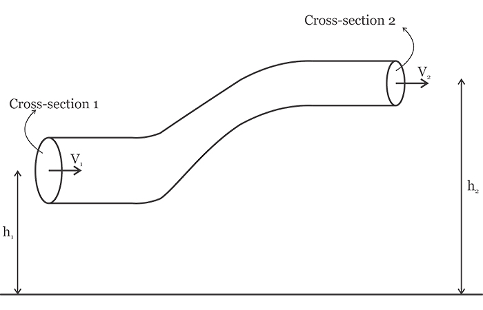 在上圖中,h 1和h 2分別表示在橫截面1和2處地球表面上方的流體高度。在管道直徑遠(yuǎn)小于管道高度的情況下,我們可以假定給定橫截面中的所有流體粒子幾乎都處于相同的高度。將能量守恒定律應(yīng)用于橫截面1和2的流體粒子,我們可以得出以下方程式:
