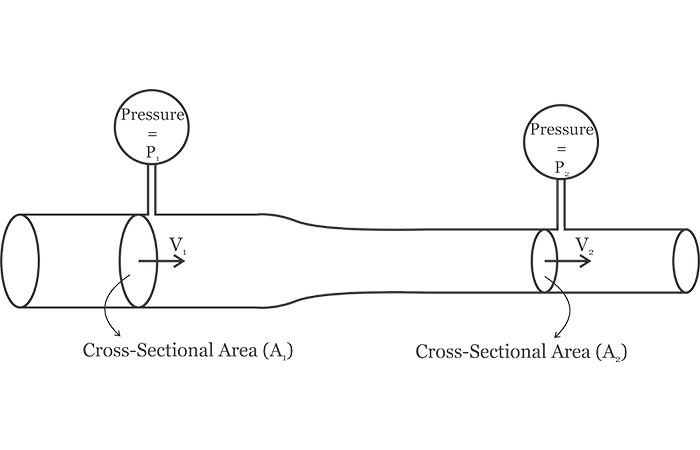 根據(jù)質(zhì)量守恒定律,質(zhì)量既不能創(chuàng)造也不能破壞。經(jīng)典力學(xué)中的這一原理以及有關(guān)流體流動的一些假設(shè)可以幫助我們將流體通過的橫截面積(A)與流體速度(V)相關(guān)聯(lián)?紤]流體通過橫截面變化的管道的穩(wěn)定流動,如圖2所示。