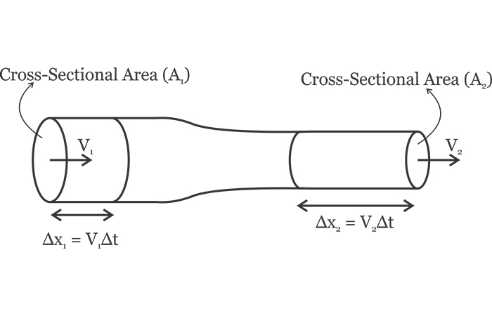 假設(shè)流體以的速度進(jìn)入管道的左端V1。超過橫截面積的流體顆粒A1 將會經(jīng)過 Δx1 一小段時(shí)間后Δt。