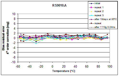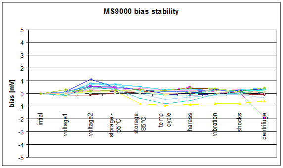 對(duì)于量程為±10g的測(cè)量,它們總的長(zhǎng)期零偏穩(wěn)定性優(yōu)于7.5mg,對(duì)于量程±5g,優(yōu)于3.75mg,其標(biāo)度因數(shù)重復(fù)性優(yōu)于400ppm。圖1顯示了對(duì)于各種量程MS9000.D的一年零偏穩(wěn)定性的測(cè)量結(jié)果。該分析結(jié)果還包括:在85°時(shí)進(jìn)行10天的加速老化實(shí)驗(yàn),這對(duì)應(yīng)于18個(gè)月的標(biāo)準(zhǔn)壽命時(shí)間,以及對(duì)加速度傳感器為期0.2毫秒,1000g的從六個(gè)方向進(jìn)行的沖擊。