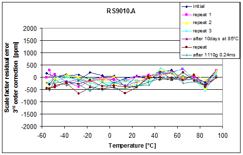 以下四張圖顯示了RS9010.A加速度傳感器的初步表現(xiàn)。我們可以看到,經(jīng)過(guò)沖擊和長(zhǎng)期老化后,所有的零偏漂移包括遲滯都優(yōu)于1.5mg, 且標(biāo)度因數(shù)穩(wěn)定性優(yōu)于150ppm. 此外,RS9010.A的振動(dòng)整流誤差可比擬機(jī)電(Q-FLEX)規(guī)格。這些綜合性能使得RS9010.A成為未來(lái)的高性能航姿系統(tǒng)的最佳候選產(chǎn)品之一。