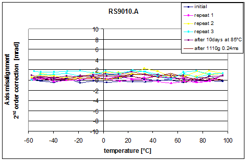 圖 5: 在整個(gè)溫度范圍的軸偏穩(wěn)定性(經(jīng)過(guò)2階多項(xiàng)式校正之后), 沖擊和加速老化