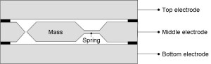 加速度傳感器的核心器件是電容式體硅微機械傳感器。COLIBRYS制造加速度傳感器的關(guān)鍵技術(shù)在于三層硅晶片結(jié)構(gòu)。