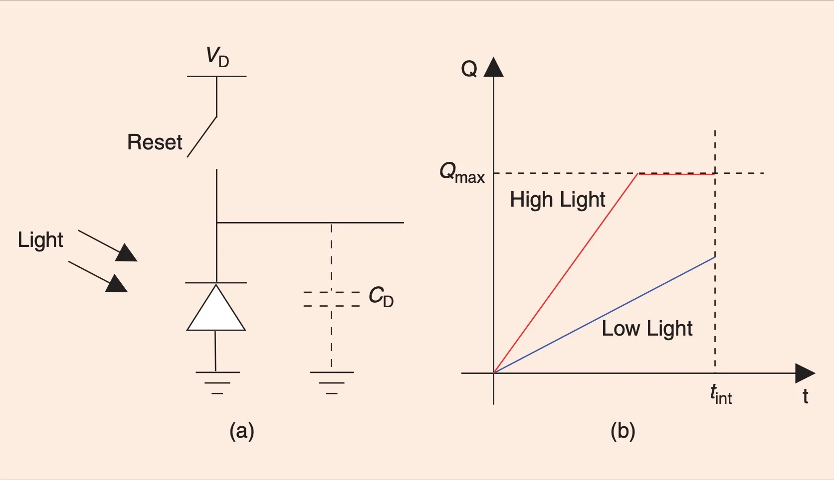 復(fù)位開關(guān)在曝光周期開始時(shí)閉合,以將光電二極管反向偏置到電壓 VD。接下來,開關(guān)打開并產(chǎn)生與入射光強(qiáng)度成比例的光電流。該電流在毫微微安培到微微安培范圍內(nèi),并且太小而無法直接測(cè)量。如果我們讓光電二極管暴露在光線下一段設(shè)定的時(shí)間,著色,電流將在二極管電容 CD 上積分。存儲(chǔ)的電荷為我們提供了更容易測(cè)量的更強(qiáng)的累積信號(hào)。此外,所包含的平均過程使累積的信號(hào)更忠實(shí)地表示測(cè)量的光強(qiáng)度,尤其是在處理微弱或嘈雜的信號(hào)時(shí)。
