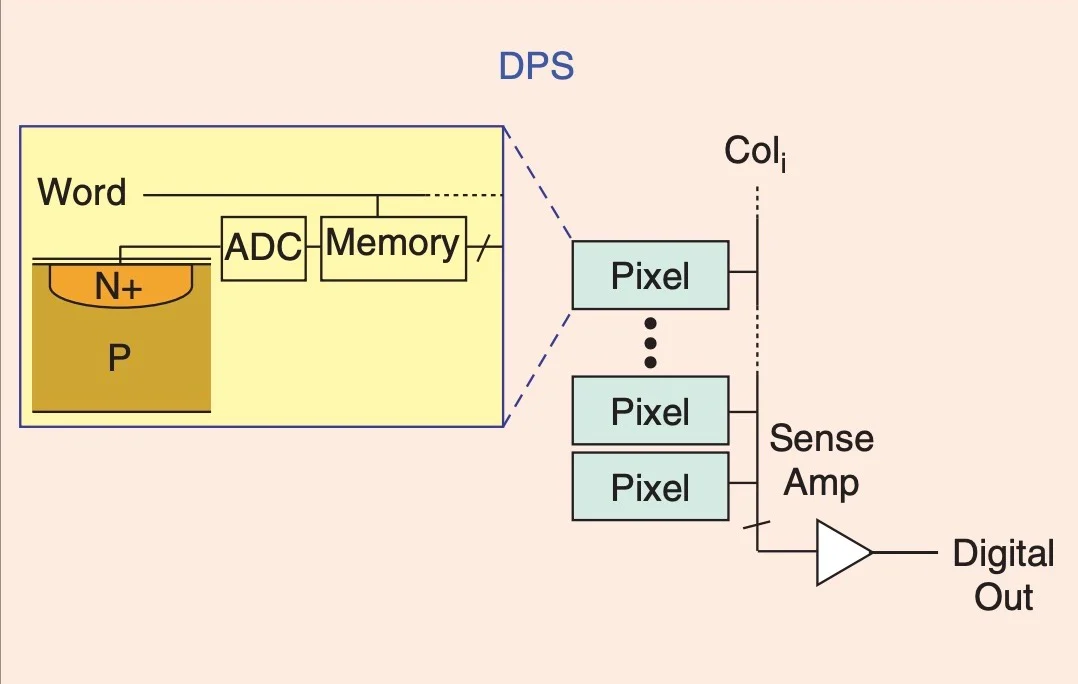 上圖顯示了一個(gè) APS(主動(dòng)像素傳感器)架構(gòu)。在 APS 器件中,每個(gè)像素位置不僅包含光電二極管,還包含放大器。一種更簡(jiǎn)單的架構(gòu),稱為 PPS(無源像素傳感器),不會(huì)將放大器集成到像素中。在 DPS(數(shù)字像素傳感器)設(shè)備中,每個(gè)像素都有自己的模數(shù)轉(zhuǎn)換器和內(nèi)存塊。因此,DPS 架構(gòu)中的像素輸出與光強(qiáng)度成比例的數(shù)字值。