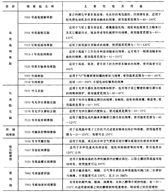 礦油類潤滑脂品種較多,目前廣泛使用的主要品種、性能及用途見表10。其中,鋰基潤滑脂幾乎兼?zhèn)淦渌砘膬?yōu)點,在多數(shù)場合下都可取代其它皂基脂,是國內(nèi)推廣應(yīng)用的新品種。