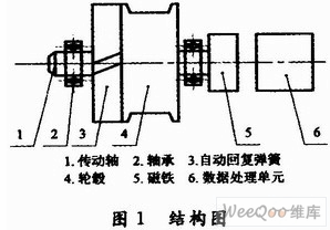 基于磁敏角度技術(shù)的拉線式位移傳感器的功能是將拉線的機械位移換成可以計量、記錄或傳送的電信號,主要由自動回復(fù)彈簧、輪轂、磁鐵以及數(shù)據(jù)處理單元等部分構(gòu)成,結(jié)構(gòu)如圖1所示。
