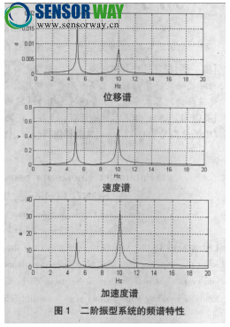 圖1為二階振型系統(tǒng)的3種頻譜特性。位移的低頻分量突 出,高階振型的幅值小,速度兼顧高低2種振型幅值,而加速度高階振型突出。