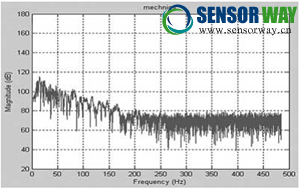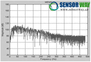 從圖中可明顯看出,壓阻式傳感器采集到的振動信號比動圈式采集到的振動信號內(nèi)容豐富,后者有明顯的信號丟失,而前者的信號幅度在環(huán)境等同條件下明顯增強(qiáng)。雖然作為無源傳感器的機(jī)械動圈式傳感器具有 低噪聲的特點(diǎn),但壓阻式的信噪比要比動圈式大的多,達(dá)6dBv,后面的幅頻特性對比曲線將說到這一點(diǎn)。