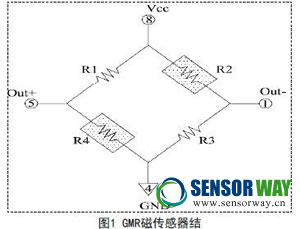 VA系列巨磁電阻磁傳感器采用惠斯通橋式結(jié)構(gòu),如圖1所示的。圖中,R1和R3是兩個(gè)阻值一樣的電阻,可隨外界磁場的變化輸出一個(gè)差分電壓信號(hào),R2和R4由于屏蔽層的作用不感應(yīng)外界磁場的變化。
