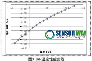 將GMR芯片放入高低溫?zé)o磁溫度箱中,每隔10℃記錄一次數(shù)據(jù),監(jiān)測(cè)傳感器從-40℃~+125℃隨溫度變化的漂移性,具體如圖3所示,芯片在整個(gè)溫度范圍內(nèi)輸出變化9.075mv,溫度系數(shù)為0.055mV/℃,可見GMR傳感器芯片的溫度性能比較優(yōu)越。