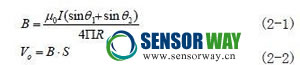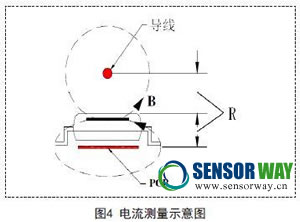 巨磁電阻用于電流檢測(cè)一般采用如圖4所示的方式進(jìn)行,將磁傳感器放置通電導(dǎo)線的正上方或正下方,同時(shí)保證通電導(dǎo)線產(chǎn)生磁場的方向與磁傳感器的敏感方向一致。按照通電導(dǎo)線周圍產(chǎn)生磁場的理論計(jì)算公式2-1可知,在待測(cè)電流和傳感器相對(duì)位置一定的情況下,待測(cè)電流的大小和磁場大小成正比,利用公式2-2這樣就可以直接測(cè)量待測(cè)電流產(chǎn)生的磁場值,再結(jié)合公式2-1就得出待測(cè)電流的大小。
