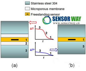 近日,中國科學院工程熱物理研究所傳熱傳質研究中心科研人員針對這一微尺度熱物性測量難題進行了較深入研究?蒲腥藛T提出了一種自適應基于獨立型傳感器的3ω技術(圖1、圖2),通過分別測試5層對稱結構(基底-微孔膜-傳感器-微孔膜-基底)及作為對照組的3層對稱結構(基底-傳感器-基底)的獨立型傳感器的溫度響應信號(圖1),結合提出的數學模型,可以較為準確地得到數十微米厚微孔膜的有效熱導率。