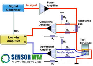 圖2 用于微孔膜測量的自適應基于獨立型傳感器的3ω系統,包含:信號發(fā)生器、鎖相放大器、前置放大器、運算模塊(運放、低溫漂電阻)及計算機自動控制系統。