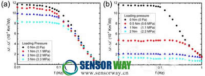 圖1 (a) 對稱5層(基底-微孔膜-傳感器-微孔膜-基底)表征結構示意圖,(b)作為對照組的對稱3層(基底-傳感器-基底)表征結構。曲線圖表示不同表征結構對應的頻域內獨立型傳感器的溫度響應信號。