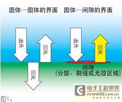 如果兩種材料之間存在間隙,則此位置不再是塑料-金屬界面,而是塑料-真空或者可能是塑料-空氣界面。由于后一材料不是固體,界面處的聲學(xué)特性發(fā)生了極大的變化,使傳回的回聲振幅極高(圖1),且大于兩種粘合良好的固體產(chǎn)生的回聲。一般>99.99%的脈沖超聲波將被反射,即便間隙僅有0.01 µm,工程師也會看到十分明亮的間隙區(qū)域。