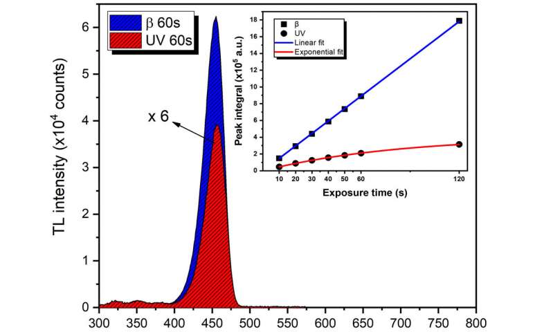 第二個(gè)是兩個(gè)響應(yīng)會根據(jù)不同的模式而變化,從而可以在未來的設(shè)備中解決紫外線干擾問題。該材料以線性方式響應(yīng)β射線:隨著其對電離輻射的暴露增加,其發(fā)光強(qiáng)度以連續(xù)曲線遞增。在紫外線輻射的情況下,材料的發(fā)光度不會線性變化。Trindade說:“有一個(gè)飽和點(diǎn),在這個(gè)飽和點(diǎn)之后,即使繼續(xù)暴露,發(fā)光也會停止增強(qiáng)!