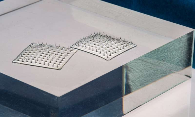 在左側(cè),您可以看到具有100針的微針陣列的示例。右邊是單針的SEM圖像。圖片來源:麻省理工學(xué)院