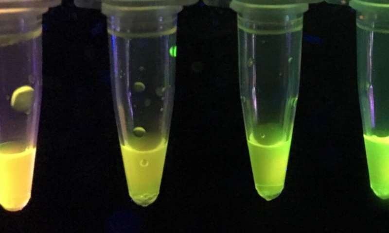 由美國化學(xué)大學(xué)的化學(xué)家開發(fā)的一種新傳感器在紫外光下會根據(jù)樣品中對硫磷或?qū)ρ趿椎暮慷優(yōu)辄S色或綠色。圖片來源:克里斯·羅比迪洛(Chris Robidillo)