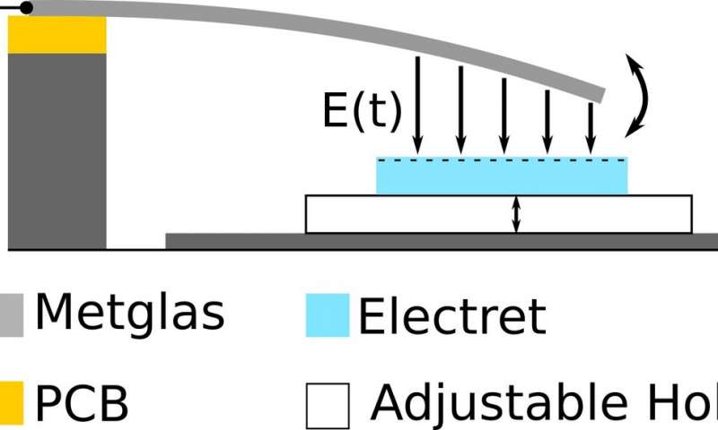 通過施加磁場,彎曲梁振動。永久充電的駐極體(藍色)拉動彎曲梁。這樣,他的振動力變得更強,并且發(fā)出的電信號也更強。學分:基爾大學