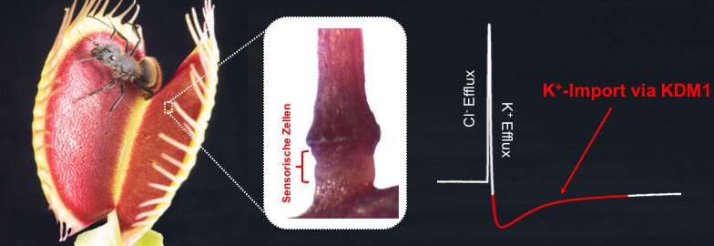 捕蠅草的潛在陷阱。中部:觸發(fā)發(fā)的基部,在觸覺刺激下,感覺細胞會誘發(fā)動作電位。在動作電位的后期,需要通過KDM1將鉀離子重新導(dǎo)入感覺細胞,以產(chǎn)生連續(xù)的動作電位。圖片來源:Ines Kreuzer,Soenke Scherzer /維爾茨堡大學(xué)