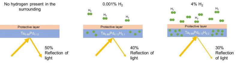 圖1.光學(xué)氫傳感器如何工作的示意圖。在氫附近,鉭(Ta)和鈀(Pd)基材料吸收氫(H)。該區(qū)域中的氫氣量越大,材料吸收的氫氣越多。隨著材料吸收氫,其光學(xué)性質(zhì)會(huì)發(fā)生變化。通過(guò)例如測(cè)量由材料反射的光的量,可以確定氫壓力或氫濃度。圖片來(lái)源:TU Delft