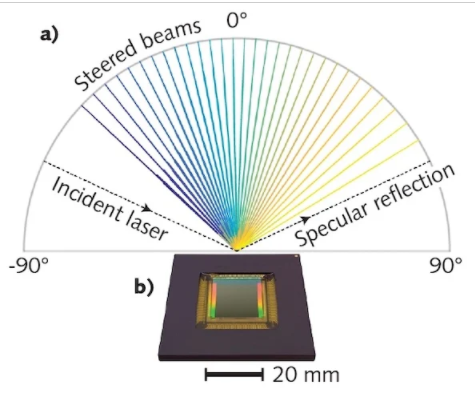 基于相同的原理,LCM 是反射式一維超表面,利用諧振亞波長元件的液晶調(diào)諧。在該方案中,每個(gè)諧振器的相位延遲與施加到它的電壓成正比,這會(huì)局部旋轉(zhuǎn)液晶,改變諧振波長并實(shí)現(xiàn) 120° 視場和整個(gè)視場的均勻效率。