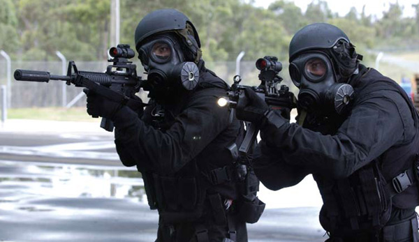 穿戴呼吸防護(hù)裝置的武裝人員。
