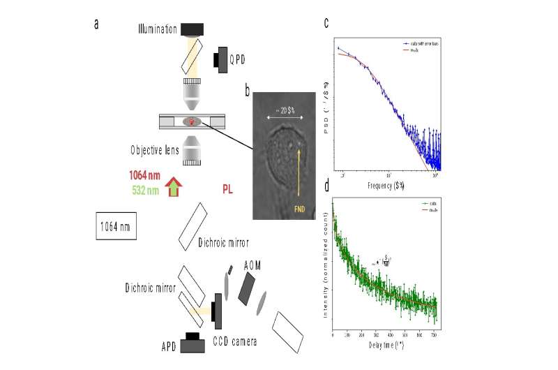 研究人員使用光鑷將納米金剛石顆粒捕獲在單個(gè)白血病細(xì)胞內(nèi),然后演示如何使用這些顆粒來測量細(xì)胞內(nèi)的磁噪聲。