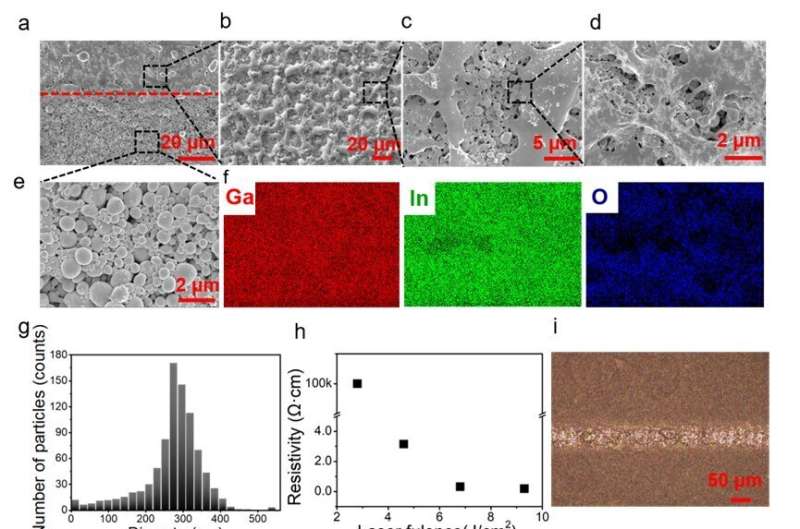 柔性濕度傳感器的表征。具有激光燒結(jié)和(a,e)的GWLM(a-d)的SEM圖像。(f) Ga、In和O分布的EDX圖像。(g) PI薄膜上未燒結(jié)的GWLM顆粒的直徑尺寸分布直方圖。(h) 不同激光通量下激光感應(yīng)導(dǎo)電GWLM路徑的電阻率。(i) 激光通量為9.4 J/cm2時燒結(jié)LM路徑的最小分辨率。(j)-(l) GA原理圖2O3基于/LM的濕度傳感器,具有各種制造參數(shù)(即電極的寬度和長度,紫外激光通量)(頂部)。Ga的循環(huán)測量2O3基于 /LM 的濕度傳感器,通過周期性地將濕度從 30% RH 更改為 95% RH(底部)。學(xué)分:光電進展(2023 年)。DOI: 10.29026/oea.2023.220172