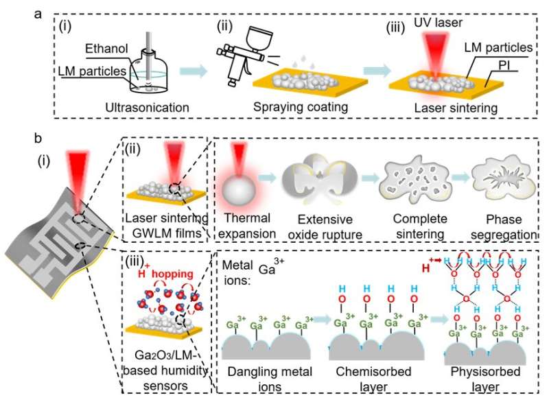 柔性電容式濕度傳感器的設(shè)計和制造。(a) 柔性GA的制造工藝2O3/LM濕度傳感器,包括超聲波,噴涂涂層和激光燒結(jié)。(b) 激光燒結(jié)形成GWLM薄膜的機理示意圖和Ga的傳感機理示意圖2O3/基于 LM 的濕度傳感器。學(xué)分:光電進展(2023 年)。DOI:10.29026/oea.2023.220172