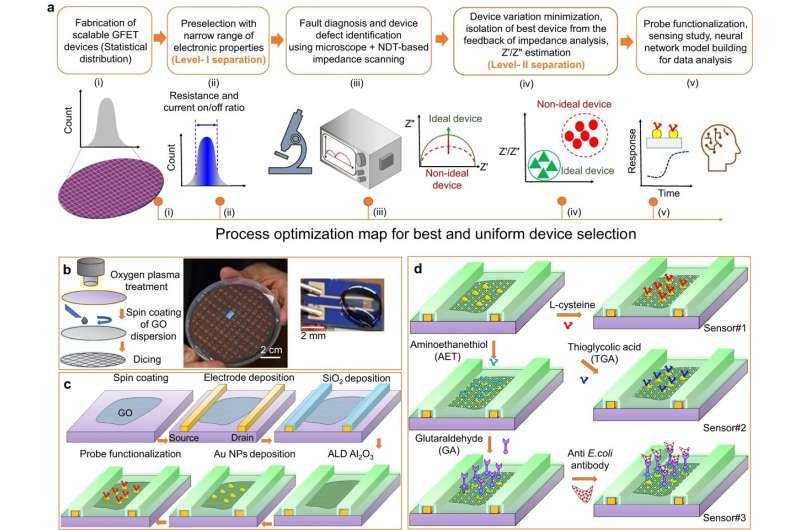石墨烯基場(chǎng)效應(yīng)晶體管(GFET)傳感器陣列的晶圓級(jí)納米制造和功能化。一種原理圖納米制造策略,使用阻抗測(cè)量進(jìn)行器件預(yù)選(故障診斷),以小化器件變化,以實(shí)現(xiàn)近乎理想的響應(yīng)模式。測(cè)試/分析程序的每個(gè)步驟都示意性地顯示(i-v),并在插圖中附有相應(yīng)的描述。b 將氧化石墨烯(GO)分散液旋涂到整個(gè)晶圓基板上,用于沉積圖案電極。照片顯示了切割后的晶圓尺寸傳感器器件和表面有一滴測(cè)試溶液的單個(gè)器件。c 基于rGO的FET傳感器器件的納米制造步驟包括通過電子束光刻進(jìn)行電極沉積,SiO的沉積2使用電子束光刻、3 nm 原子層沉積 (ALD) 衍生的 Al 在電極上的保護(hù)層2O3作為頂部柵極氧化物,濺射金納米顆粒(NPs)作為探針的錨定位點(diǎn),并實(shí)現(xiàn)探針功能化。d 傳感器1-3使用特定生化和抗體探針進(jìn)行探針功能化的示意圖步驟。自然通訊 (2023)。DOI: 10.1038/s41467-023-39701-0