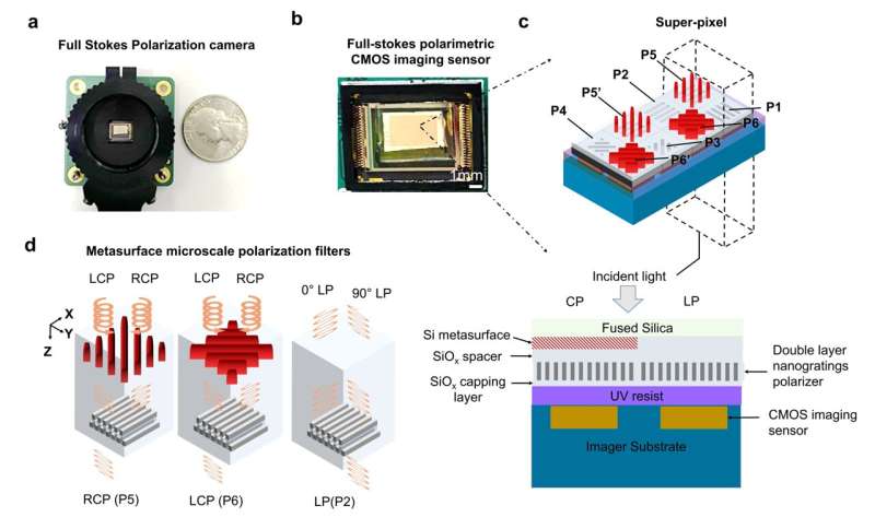 a,全斯托克斯偏振相機(jī)的圖像旁邊的一美元硬幣(鏡頭未連接)。b全Stokes偏振CMOS成像傳感器圖像c頂部:芯片集成全Stokes CMOS偏振成像傳感器的3D概念圖。其中P1-P4分別表示傳輸軸為0°、90°、45°、135°的LP濾波器。P5、P5′和P6、P6′分別表示右手圓偏振(RCP)和左手圓偏振(LCP)的手性超表面濾光片。這里P5和P5', P6和P6'在維度上是相同的。下圖為芯片集成偏振成像傳感器二維截面圖。d分別負(fù)責(zé)傳輸RCP光和LCP光的一對手性超表面(P5, P6)和LP濾波器(P2)的三維概念圖。致謝:左佳偉、白靜、崔shinhyuk、Ali Basiri、陳夏輝、王超、姚宇