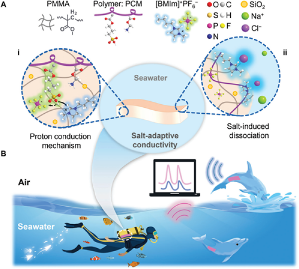 近年來,中國科學(xué)院寧波材料技術(shù)與工程研究所智能高分子材料團(tuán)隊研究員陳濤和博士魏俊杰,致力于離子導(dǎo)電凝膠基智能傳感材料的研究,并利用疏水界面對水分子和導(dǎo)電離子的擴(kuò)散屏障功能實現(xiàn)了導(dǎo)電凝膠材料的水下多功能傳感應(yīng)用。然而,含鹽海水的高導(dǎo)電性會對離子凝膠傳感器的傳感性能產(chǎn)生明顯的抑制作用,導(dǎo)致離子導(dǎo)電凝膠的海洋傳感性能存在不足。對此,該團(tuán)隊近期在疏水界面結(jié)構(gòu)的基礎(chǔ)上,進(jìn)一步利用質(zhì)子導(dǎo)電機(jī)制和鹽誘導(dǎo)解離效應(yīng)設(shè)計了在海水環(huán)境中具有鹽適應(yīng)能力的離子液體凝膠材料,實現(xiàn)了海洋傳感應(yīng)用。