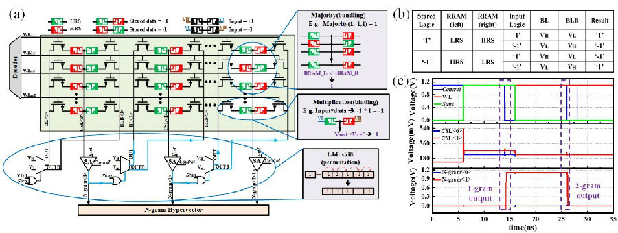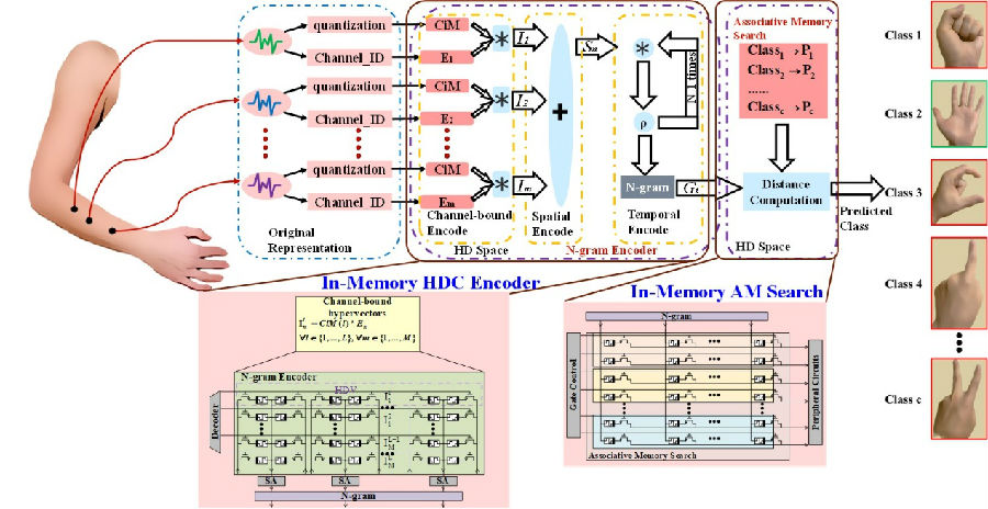 針對這一問題,微電子所微電子器件與集成技術研發(fā)中心劉明院士團隊的尚大山研究員與香港大學合作,基于阻變存儲器(RRAM)的存內計算范式,開發(fā)了面向時空信號處理的存內高維計算編碼技術。團隊采用2T2R(兩個晶體管與兩個RRAM為一個單元)陣列作為存內高維計算的編碼器,通過在編碼器中原位執(zhí)行綁定和捆綁操作,并通過設計簡單的外圍電路進行重排操作,實現(xiàn)了對時空信號的編碼。該方法利用電阻分壓原理映射超向量的元素,避免了矩陣—向量乘法過程中的陣列會聚電流過大的問題。此外,團隊采用1T1R陣列作為關聯(lián)記存儲器。在訓練階段,每個類別編碼后的超向量通過疊加構成該類的原型向量,并預先存儲至關聯(lián)記憶存儲器中。在推理階段,輸入的時空信號首先被編碼為查詢超向量,然后以存內搜索的方式與關聯(lián)記憶存儲器中的類原型向量進行相似度計算。具有最大相似度的類即為預測結果。該設計在基于腦肌電信號的手勢識別任務中實現(xiàn)了97.96%的識別率。40nm工藝節(jié)點仿真結果表明該設計具有高魯棒、高通量、低延時等優(yōu)勢,同時計算能效相較于當前的已報道的高維計算編碼器提升了39倍。這項研究結果為在資源有限的邊緣系統(tǒng)實現(xiàn)對時空信號的實時處理提供了一種高效的解決方案。